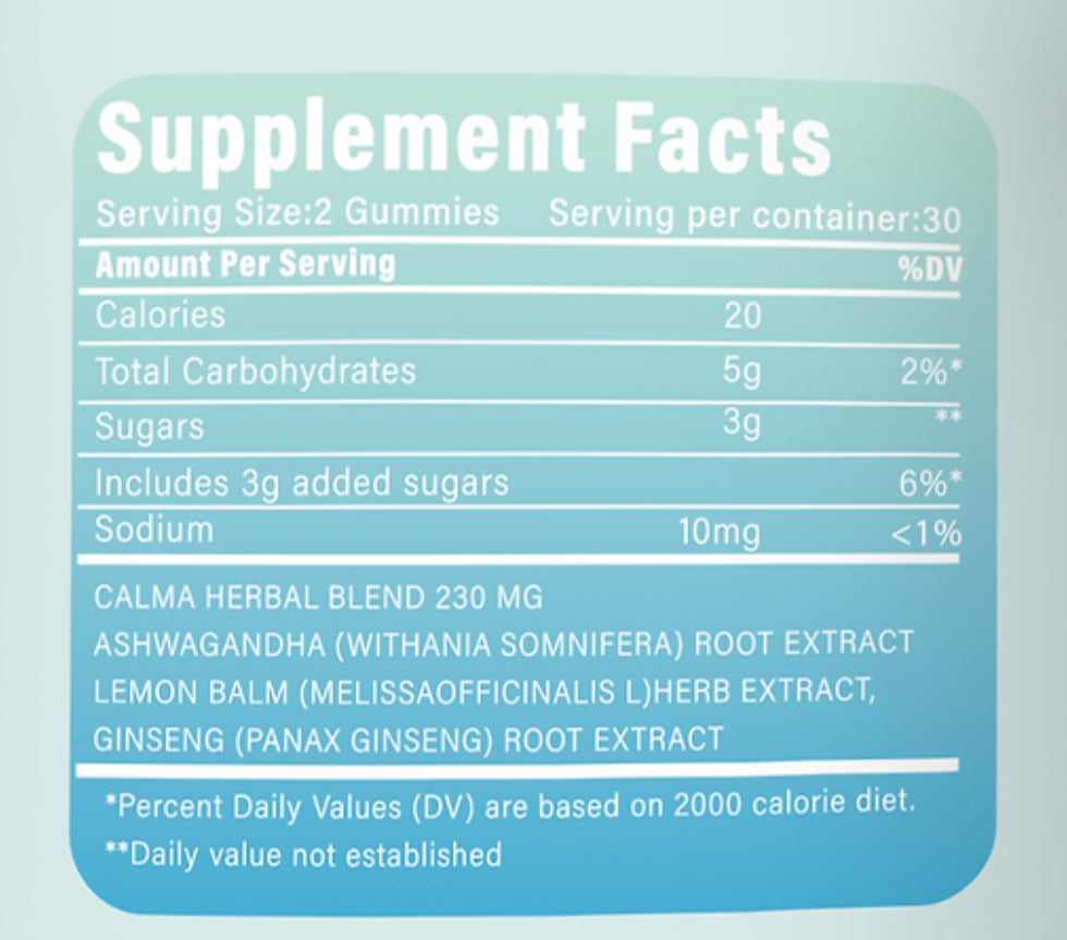 Indulge in tranquility with our Calma, relax gummies crafted with a blend of nature's soothers – ashwagandha, lemon balm, and ginseng. Experience a harmonious balance as these natural ingredients work together to promote relaxation, ease stress, and uplift your mood, allowing you to find your inner calm in every delicious bite.